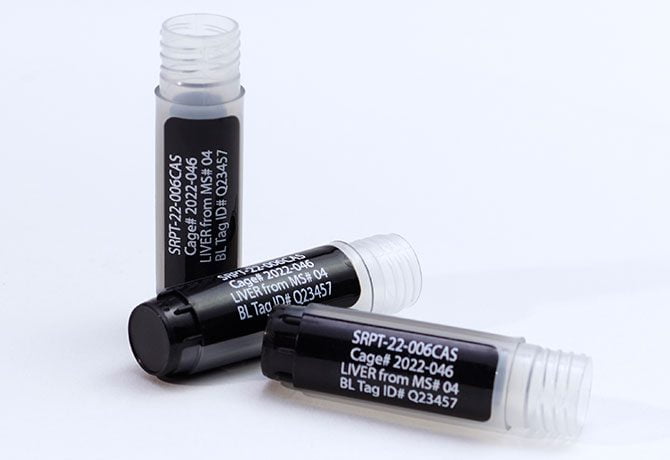 Overall, laser is a marking technology that offers durability and adaptability to unique shapes compared to pressure sensitive labels. It’s a perfect match for laboratories that need a more robust solution than pressure-sensitive, labels but don’t require the color capabilities of cured ink, or the permanency of ceramic or fused IDs.