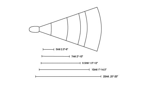 Your bar code scanner’s manual should contain an image that looks something like the one depicted above. This image displays the ranges at which your scanner can read bar codes of different sizes. In this case, our reader can read 5mil bar codes at a distance between 2.5″-6″, but it can read a 10mil bar code between 1″ and 14.5″.